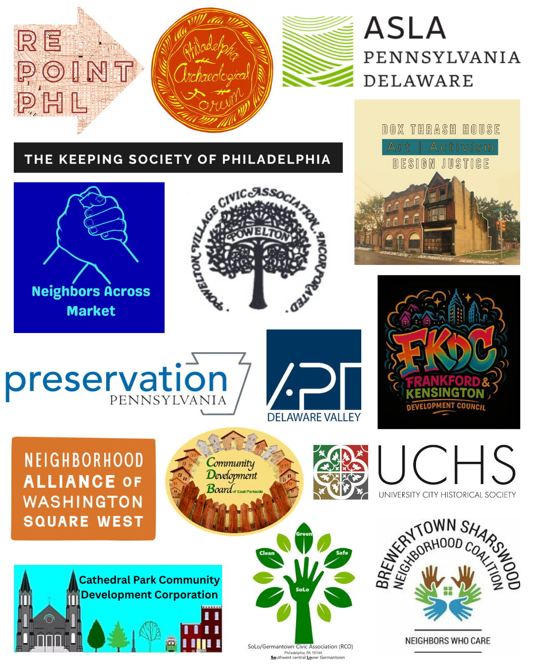 Members: American Society of Landscape Architects, Pennsylvania-Delaware Chapter • Association for Preservation Technology/Delaware Valley Chapter • Brewerytown Sharswood Neighborhood Coalition • Cathedral Park Community Development Corporation • Community Development Board of East Parkside • The Dox Thrash Project • Frankford & Kensington Development Council • Keeping Society of Philadelphia • Neighbors Across Market • Neighborhood Alliance for Washington Square West • Philadelphia Archaeological Forum • Preservation Pennsylvania • Powelton Village Civic Association • RePoint Philadelphia • SoLo/Germantown Civic Association • University City Historical Society